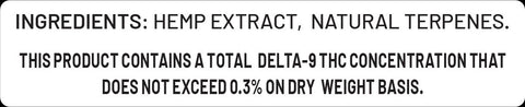 Ingredients: Hemp extract, natural terpenes. This product contains a total delta-9 concentration that does not exceed 0.3% on dry weight basis.